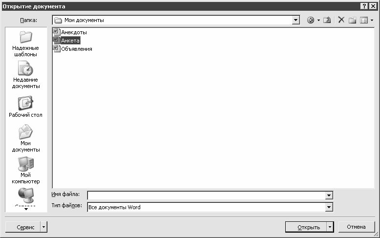 Чтобы открыть документ Word, который был создан ранее, следует в меню Office выполнить команду Открыть. В результате на экране отобразится окно, изображенное на рис. 2.5.