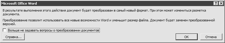Команда Преобразовать, которая также находится в меню Office, предназначена для преобразования текущего документа в документ самого последнего формата (Word 2007). Это, во-первых, позволит для данного документа использовать все возможности Word 2007 (в противном случае работа с документом возможна только в режиме ограниченной функциональности, что, впрочем, тоже немало), а во-вторых – существенно уменьшить размер файла документа.