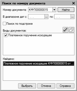 Поиск по номеру – эту команду рекомендуется использовать при работе с большим количеством документов. Она предназначена для быстрого поиска требуемого документа по его номеру в заданном интервале времени (отметим, что интервал времени можно и не задавать – в этом случае поиск будет вестись только по номеру документа). При выполнении данной команды на экране отображается окно, изображенное на рис. 1.23.