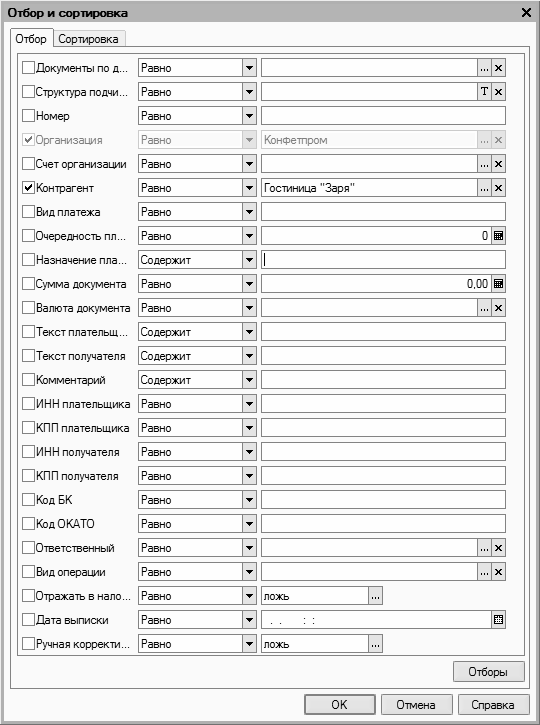 На вкладке Отбор осуществляется настройка параметров фильтра. В левой части вкладки содержится перечень условий фильтра (Номер, Организация, Вид операции и др.). Для выбора требуемого условия необходимо установить соответствующий флажок. Справа с клавиатуры либо помощью кнопки выбора указывается конкретное значение выбранного фильтра: например, на рис. 1.24 выбран фильтр Контрагент, а значение фильтра – Гостиница «Заря». Между условием фильтра и его значением из раскрывающегося списка следует выбрать вариант применения фильтра (Равно, Не равно, В списке, Не в списке и др. – у разных условий фильтра разные варианты применения). Например, на рис. 1.24 для фильтра Контрагент выбран вариант Равно. Это означает, что после применения фильтра в списке останутся только документы, которые оформлены с контрагентом Гостиница «Заря». Если же установить вариант Не равно, то из списка будут исключены все документы, оформленные от имени контрагента Гостиница «Заря» (попросту говоря, с помощью варианта Не равно включается обратный фильтр).