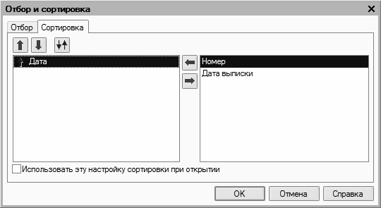 В правой части вкладки содержится перечень возможных признаков сортировки, в левой – те из них, которые необходимо применить. Перемещение признаков слева направо и наоборот осуществляется с помощью кнопок со стрелками, расположенных в центральной части вкладки. Порядок использования элементов сортировки и переключение направления сортировки осуществляется с помощью кнопок со стрелками, которые находятся слева вверху вкладки. Если установить флажок Использовать эту настройку сортировки при открытии, то при последующих открытиях окна списка все позиции в нем будут по умолчанию отсортированы в соответствии с текущими настройками сортировки.