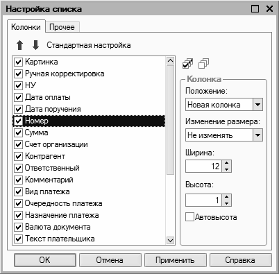 Данное окно состоит из двух вкладок: Колонки и Прочие. На вкладке Колонки путем установки соответствующих флажков следует указать колонки, которые будут отображаться в окне списка. По умолчанию установлены все флажки. Изменение порядка следования колонок в списке осуществляется с помощью кнопок со стрелками, которые находятся слева вверху вкладки. При необходимости можно быстро вернуться к настройке, используемой по умолчанию – для этого следует воспользоваться кнопкой Стандартная настройка.