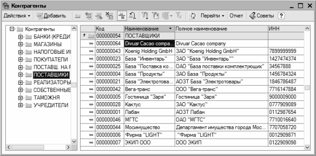 На данном рисунке представлено окно справочника контрагентов, которое, по сути, также является интерфейсом списка. Как видно на рисунке, оно состоит из двух панелей: слева формируется перечень групп контрагентов (Покупатели, Поставщики, Заказчики, и т. д.), а справа отображается содержимое текущей группы. Здесь мы привели это окно лишь для примера, а более подробно рассмотрим его позже, в соответствующем разделе.