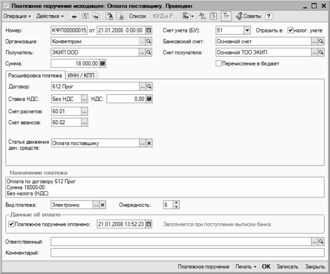 Для ввода и изменения данных в программе предусмотрены интерфейсы редактирования. Пример такого интерфейса (в данном случае показано окно редактирования исходящего платежного поручения) показан на рис. 1.29.