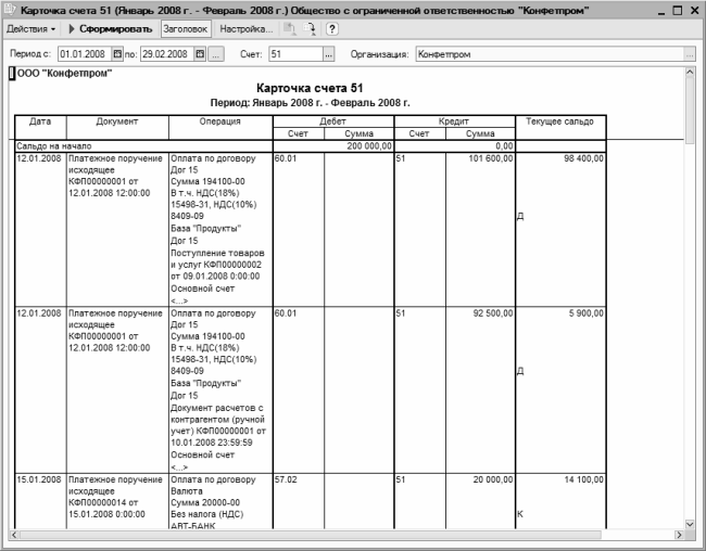 Здесь показано окно настройки и формирования одного из самых популярных отчетов – Карточки счета, но и большинство других отчетов формируются аналогичным образом. В верхней части окна задаются параметры формирования отчета (интервал времени, данные которого должны быть включены в отчет, счет бухгалтерского учета или наименование контрагента, и др.), а в нижней после нажатия кнопки Сформировать отобразится сам отчет. Позже мы подробно рассмотрим порядок получения наиболее популярных отчетов в программе «1С: Бухгалтерия 8».