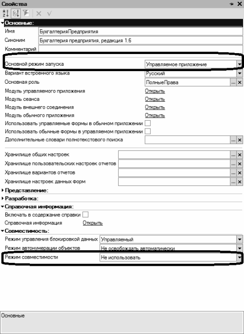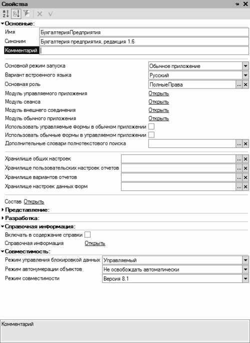 В данном окне осуществляется просмотр и редактирование свойств конфигурации. Обратите внимание – многие параметры объединены в разделы, и чтобы открыть или закрыть раздел, нужно щелкнуть мышью на маленьком черном треугольнике слева от его названия. Например, на рис. 1.31 разделы Представление и Разработка являются закрытыми, а разделы Основные, Справочная информация и Совместимость – открытыми. По умолчанию при открытии данного окна в нем будут открыты все разделы, поэтому его вид может отличаться от того, как показано на рис. 1.31. Если все разделы окна являются открытыми, для навигации используйте вертикальную полосу прокрутки.