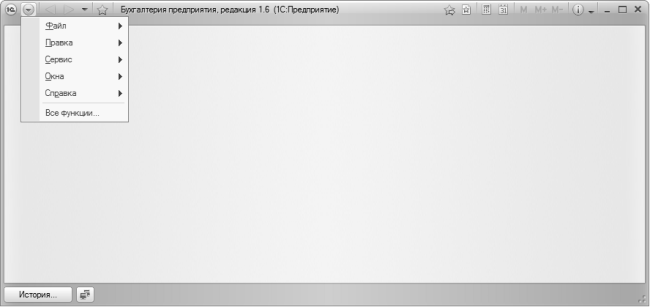 Несмотря на то, что конфигурация у нас уже подключена к платформе, мы видим, что практически никаких инструментов для работы интерфейс прикладного решения не содержит. Главное меню теперь находится не вдоль верхней границы окна программы, а открывается в виде обычного меню, содержащего несколько подменю (см. рис. 1.33). Причем в состав главного меню включены только команды, которые относятся к технологической платформе, а не к конфигурации. Иначе говоря, независимо от того, с какой конфигурацией вы работаете – «Бухгалтерия предприятия», «Управление торговлей» и т. д., главное меню программы в режиме «1С Предприятие» будет содержать один и тот же набор функций.