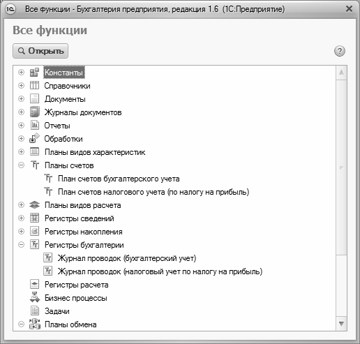 В данном окне содержится иерархический перечень всех объектов конфигурации – примерно в таком же виде, как он сформирован в Конфигураторе (см. рис. 1.17). Чтобы перейти, например, в режим работы с приходными кассовыми ордерами, раскройте ветвь Документы, выделите щелчком мыши позицию Приходный кассовый ордер и нажмите кнопку Открыть (можно также просто дважды щелкнуть мышью на требуемой позиции). Аналогичным образом осуществляется переход в режим работы со справочниками, отчетами и прочими объектами конфигурации.