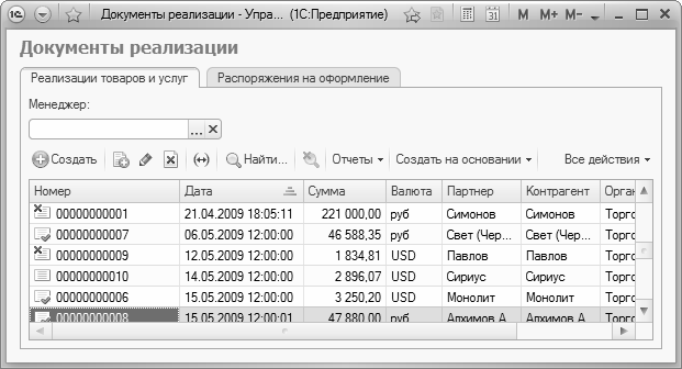 Помеченные на удаление объекты обозначаются в окнах списка соответствующим символом (крестиком). На рис. 2.3 показано окно списка документов реализации, в котором имеется два помеченных на удаление объекта (первая и третья позиции списка).