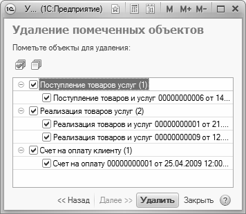 В данном окне содержатся все объекты, которые ранее были помечены на удаление, причем они сгруппированы по типам (документы на поступление, счета на оплату, номенклатурные позиции и т.д.). Нужно с помощью соответствующих флажков выбрать те объекты, которые вы хотите удалить (по умолчанию установлены все флажки), и нажать кнопку Удалить.
