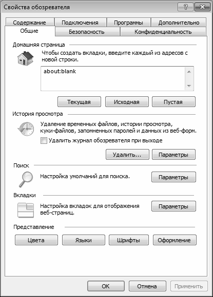 Для перехода в режим настройки параметров Internet Explorer необходимо выполнить команду главного меню Сервис ▶ Параметры. При активизации данной команды на экране отображается окно, изображенное на рис. 1.3.