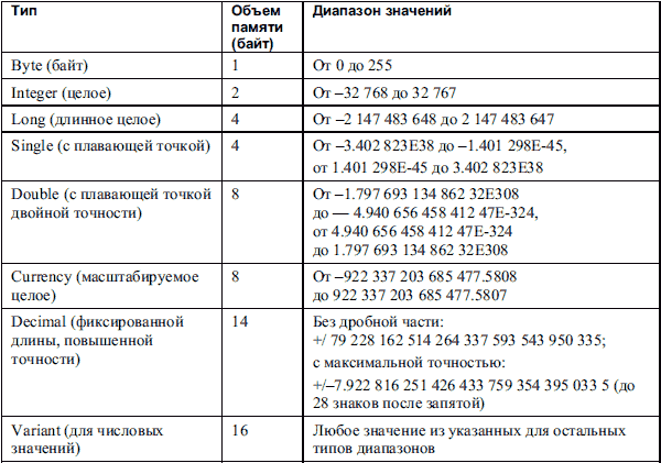 Численные типы данныхОсновные характеристики численных типов VBA приведены в табл. 1.2.