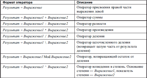 Язык VBA содержит большое количество встроенных операторов, которые позволяют выполнять разнообразные действия над всеми встроенными в VBA типами. Операторы и их операнды по определенным правилам составляются в выражения. Данный раздел посвящен описанию операторов, предоставляемых VBA-npoграммисту.