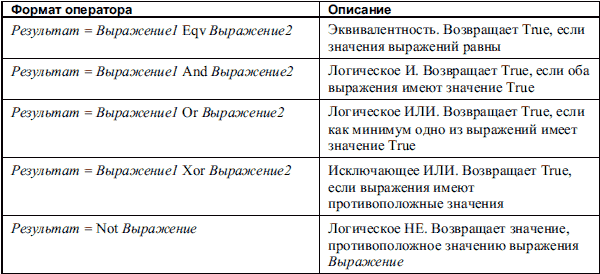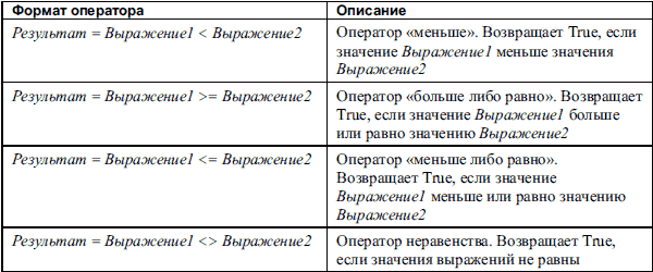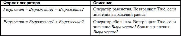 Результатом выполнения всех операторов сравнения является значение типа Boolean. Если операнды какого-либо оператора удовлетворяют его условию, то возвращается значение True, иначе возвращается значение False. Все операторы сравнения, поддерживаемые VBA, приведены в табл. 1.4.