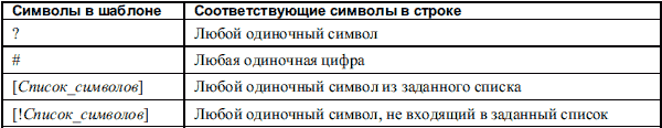 Если нужно, чтобы в шаблоне присутствовали специальные символы, приведенные в табл. 1.5, то необходимо заключить соответствующие знаки в скобки: ([), (]), (#), (?), (*).