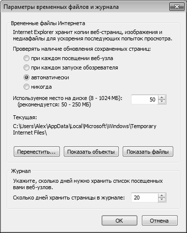 В данном окне устанавливается требуемый режим проверки обновления сохраненных страниц, отображается расположение папки, содержащей временные файлы Интернета, и указывается максимальный объем места на жестком диске, предназначенного для этой папки. С помощью кнопки Переместить можно переместить папку временных файлов Интернета в указанное место; при этом на экране открывается окно Обзор папок, в котором следует указать требуемый путь. Для немедленного открытия папки с временными файлами Интернета используйте кнопку Показать файлы.