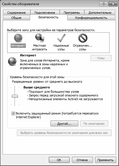 При необходимости можно восстановить стандартные параметры безопасности для каждой зоны. Это осуществляется нажатием кнопки По умолчанию (предварительно следует выделить значок той зоны Интернета, для которой выполняется данная операция). Чтобы применить используемые по умолчанию параметры сразу для всех зон, нажмите кнопку Выбрать уровень безопасности по умолчанию для всех зон.