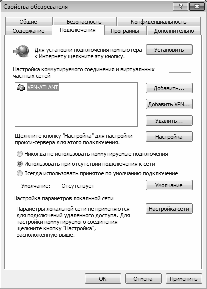 На вкладке Подключения, содержимое которой показано на рис. 2.6, содержатся сведения об имеющихся в системе подключениях к Интернету.