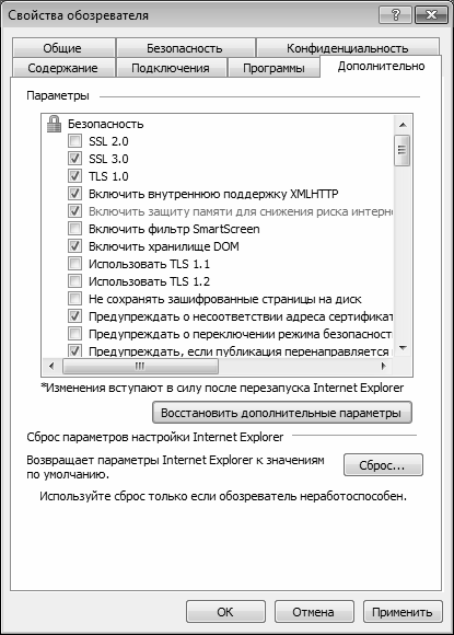 На вкладке Дополнительно (рис. 2.7) содержится ряд дополнительных параметров, определяющих некоторые режимы интернет-обозревателя. В частности, с помощью соответствующих флажков можно включать/выключать отображение рисунков и их рамок, воспроизведение анимации, звуков и видео на веб-страницах, использовать автоматическую проверку обновления Internet Explorer и т.д. В отдельный раздел вынесены параметры безопасности. При необходимости можно восстановить значения параметров, предлагаемые системой по умолчанию – для этого следует нажать кнопку Восстановить дополнительные параметры.