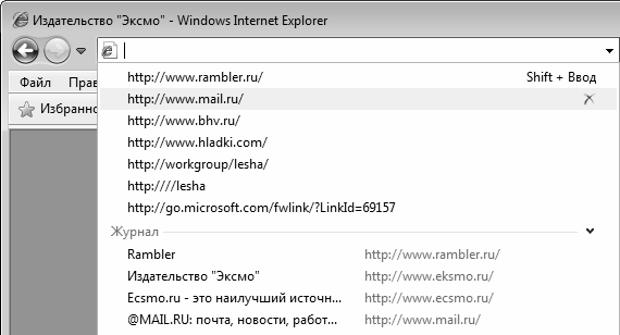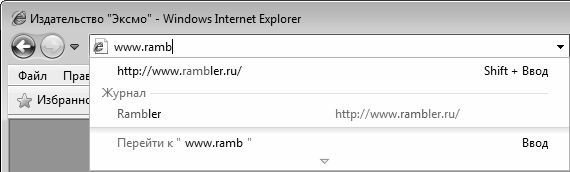 Содержимое раскрывающегося списка формируется программой автоматически по мере ручного ввода адресов в адресную строку. Иначе говоря, если вы хотя бы один раз вручную набрали адрес, то впоследствии можно будет выбрать его из раскрывающегося списка. Кроме этого, по мере ввода адреса, если он уже вводился ранее, программа будет предлагать автоматическое заполнение (рис. 2.10).