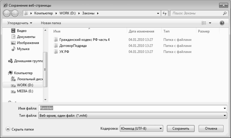 Это стандартный интерфейс сохранения объектов, используемый в Windows 7. Отметим, что веб-страницу можно сохранить в формате *.html, в текстовом формате (*.txt), а также в виде веб-архива, который представляет собой один файл с расширением *.mnt. Главное отличие веб-архива от html-формата заключается в том, что страница будет сохранена в одном файле (напомним, что html-формат подразумевает сохранение страницы в виде html-файла и прилагающейся к нему папки с используемыми на странице рисунками и прочими объектами).