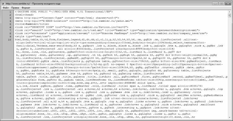 В программе реализована возможность просмотра HTML-кода текущей веб-страницы. Вряд ли начинающие пользователи, на которых и рассчитана эта книга, будут активно применять данный механизм, но иногда он бывает очень полезен. Для просмотра HTML-кода открытой в окне Internet Explorer страницы выполните команду главного меню Вид ► Просмотр HTML-кода – в результате программный код страницы отобразится в отдельном окне (рис. 2.14).