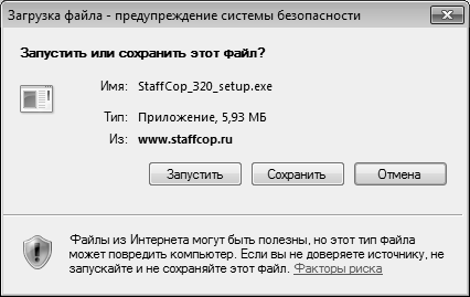 В данном окне выбирается вариант действий: Запустить, Сохранить или Отмена. При выборе варианта Запустить файл будет сразу запущен на исполнение, однако данный вариант использовать настоятельно не рекомендуется, поскольку этот объект может оказаться вирусом или иным вредоносным программным обеспечением (программой-шпионом, рекламным модулем и т.п.). Кнопка Отмена предназначена для выхода из данного режима и отказа от скачивания файла.
