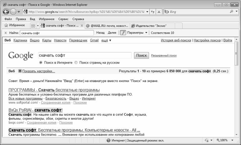 При работе с веб-страницами больших размеров может возникать проблема быстрого поиска информации. Например, в большом прайс-листе вам нужно найти какое-то конкретное наименование, и т.п. Для решения подобных задач в Internet Explorer предусмотрен режим быстрого поиска, вызываемый с помощью команды главного меню Правка ► Найти на этой странице или нажатием комбинации клавиш Ctrl+F. При активизации данной команды под панелью вкладок появляется панель поиска (рис. 2.17).