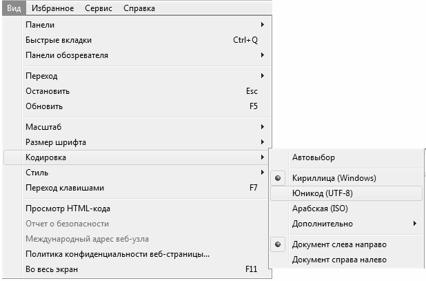 В данном случае причина кроется в неправильно выбранной кодировке символов. Устранить проблему можно самостоятельно: для этого нужно перевыбрать кодировку в подменю Вид ► Кодировка (рис. 2.19).