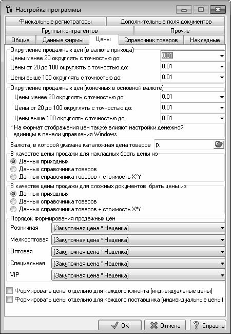 Настройка параметров ценообразования осуществляется на вкладке Цены, содержимое которой показано на рис. 1.3. Выполненные здесь настройки будут использованы для формирования цен на реализуемые товары, а также для отображения этих цен в интерфейсах и отчетах программы.