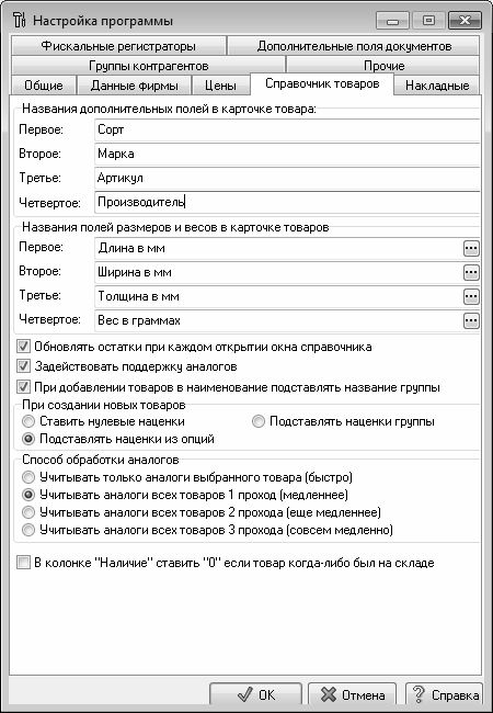 В программе реализована возможность тонкой настройки справочника товаров, в зависимости от специфики работы. Параметры настройки справочника товаров расположены на вкладке Справочник товаров, содержимое которой показано на рис. 1.4.