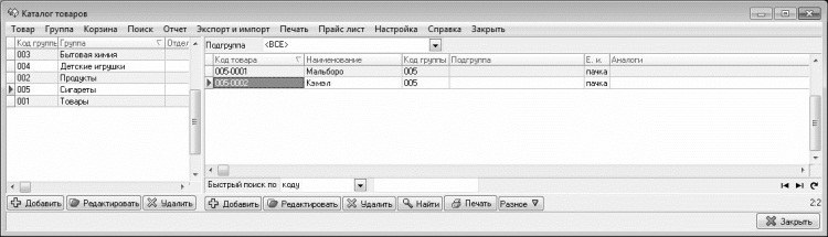 Как видно на рисунке, окно справочника разделено на две части: левую и правую. Это обусловлено тем, что в программе реализована возможность объединения однотипных товаров в группы (например, группа Соки, группа Сигареты, и т. п.). В левой части окна отображается перечень групп, в правой части – список товарно-материальных ценностей той группы, которая в левой части выделена курсором. Таким образом, последовательно щелкая курсором на названиях групп в левой части окна, можно быстро просмотреть содержимое каждой группы.