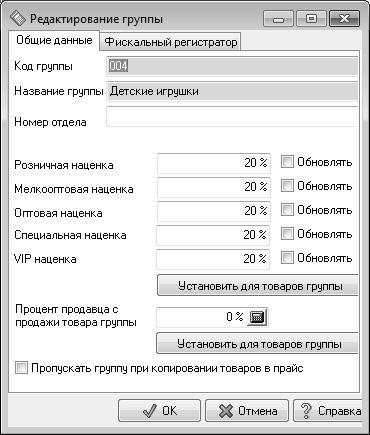 Если для всех товаров данной товарной группы должна применяться одинаковая наценка (например, все сигареты в ларьке реализуются с одинаковой розничной наценкой – 30 %, или с одинаковой оптовой наценкой – 20 %), то размер этой наценки (в процентах) можно указать в соответствующем поле. При вводе значения (размера наценки) следует учитывать, что символ процента вводить не нужно – он будет проставлен автоматически.