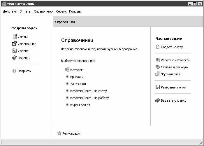 Команды меню Справочники предназначены для перехода в режим работы с каталогами и справочниками программы (справочник бригад, каталог материалов, каталог работ, справочник валют, и т. д.).