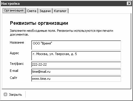 На вкладке Организация (см. рис. 1.2) осуществляется ввод информации об организации, от имени которой будет вестись работа в программе. Эти данные используются при выводе документов на печать. В соответствующих полях с клавиатуры вводится название организации, ее адрес, телефон, электронный адрес и адрес сайта. Все поля данной вкладки являются необязательными для заполнения.