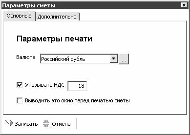 Если установлен флажок Указывать НДС, то в смету будет включена информация о налоге на добавленную стоимость. При установленном данном флажке справа открывается поле, в котором с клавиатуры вводится ставка налога в процентах (на рис. 1.3 в данном поле введено значение 18).