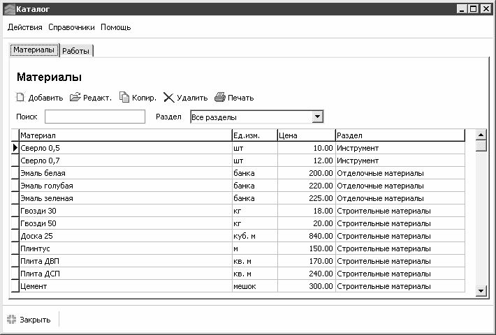 На данной вкладке представлен перечень введенных ранее материалов. Для каждой позиции списка в соответствующих колонках последовательно отображается наименование материала, его единица измерения, цена за единицу и раздел. Отметим, что при первом открытии каталога в нем не будет содержаться ни одной позиции.