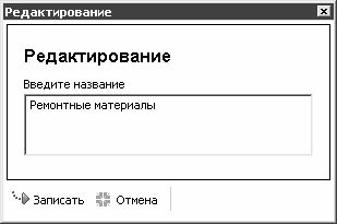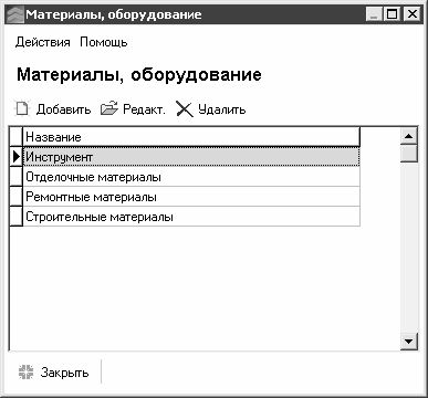 В данном окне содержится список введенных ранее разделов материалов. Для добавления нового раздела нужно нажать кнопку Добавить, расположенную над списком, либо выполнить команду Действия►Добавить; чтобы отредактировать введенный ранее раздел, следует нажать кнопку Редакт. или выполнить команду Действия►Редакт. При выполнении любого из перечисленных действий на экране открывается окно, которое показано на рис. 1.6.