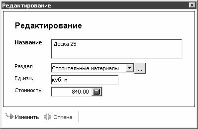 Чтобы добавить в каталог материалов (см. рис. 1.4) новый материал, нужно нажать кнопку Добавить, которая находится над списком материалов; для перехода в режим редактирования информации о введенном ранее материале предназначена кнопка Редакт. При необходимости можно быстро ввести в каталог новый материал на основании введенного ранее материала: для этого нужно выделить в списке курсором материал-источник и нажать кнопку Копир. Эту возможность удобно использовать, когда у вводимого материала большинство параметров совпадают с введенным ранее материалом: например, нужно ввести данные о гвоздях разных размеров (20, 25, 30, 35, 40, 45 и т. д.), у которых единица измерения, цена и раздел совпадают, а в названии нужно отредактировать только размер.