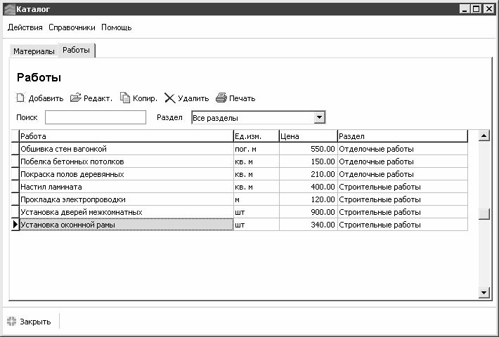 В каталоге содержится список введенных ранее работ. Для каждой позиции списка в соответствующих колонках последовательно отображается название работы, кратко отражающая ее суть, единица измерения, цена за единицу (иначе говоря, расценка) и раздел. При первом открытии каталога в нем не будет содержаться ни одной позиции.