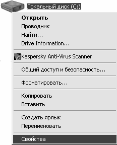 Для проверки жесткого диска следует открыть Мой компьютер, спозиционироваться на диске, содержащем системную папку Windows XP, и воспользоваться командой контекстного меню Свойства (рис. 2.1).
