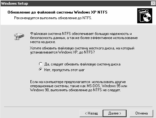 На следующем этапе программа предложит выполнить обновление файловой системы до NTFS (рис. 2.11).