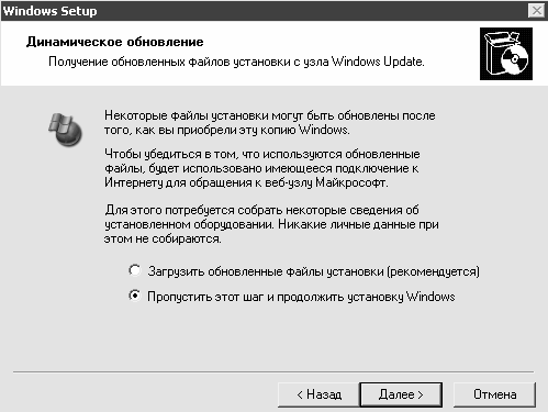 После нажатия в данном окне кнопки Далее программа установки предложит выполнить обновление компонентов Windows через Интернет (рис. 2.12).