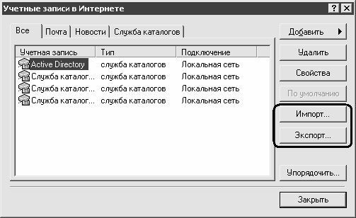 В данном окне находятся кнопки Импорт и Экспорт (они выделены на рис. 2.4). С помощью кнопки Экспорт осуществляется сохранение учетных записей по указанному пути, кнопка Импорт используется для восстановления учетных записей после переустановки операционной системы. При нажатии на любую из этих кнопок на экран выводится окно, в котором по обычным правилам Windows указывается путь для сохранения (восстановления).