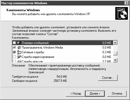 Чтобы выбрать для установки требуемый компонент, необходимо установить возле него флажок; при выборе компонента для удаления флажок следует сбросить. Затененным флажком в списке отмечены частично установленные компоненты (например, на рис. 2.6 к ним относится компонент Сетевые службы).