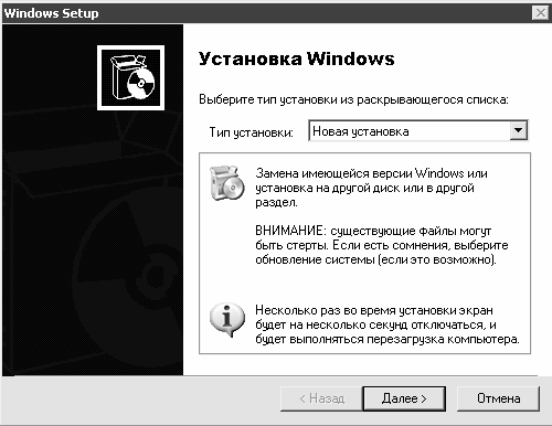В данном окне в поле Тип установки необходимо выбрать требуемый способ установки системы. При выборе способа Обновление (рекомендуется) выполняется автоматическое обновление имеющейся версии операционной системы; при этом сохраняются ранее установленные на компьютере файлы, папки, приложения, параметры настройки и т.п. Если же выбран способ Новая установка, то информация с компьютера будет удалена. При переустановке Windows XP следует выбрать способ Новая установка и нажать кнопку Далее.