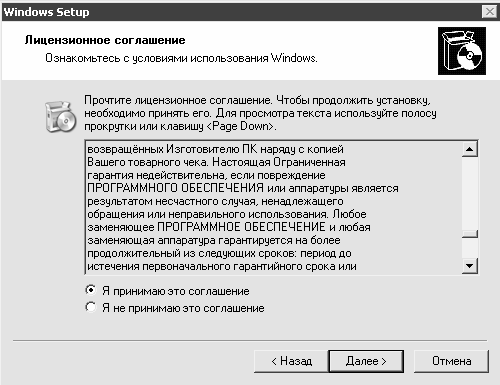 На следующем этапе следует ознакомиться с лицензионным соглашением, в котором оговорены условия использования Windows XP (рис. 2.8).