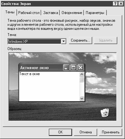 Это окно состоит из следующих вкладок: Темы, Рабочий стол, Заставка, Оформление, Параметры. Каждая вкладка включает в себя набор параметров, предназначенных для настройки тех либо иных элементов интерфейса. Измененные параметры каждой вкладки вступают в силу только после нажатия в данном окне кнопок Применить либо ОК (в последнем случае одновременно со вступлением в силу выполненных изменений окно Свойства:Экран будет закрыто); с помощью кнопки Отмена осуществляется выход из данного режима без сохранения изменений. Рассмотрим подробнее содержимое каждой вкладки.