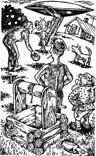 Я прошел через двор, приглядываясь к зеленому существу. Оно было не выше домового, с большой головой, локаторами вместо ушей и канцелярской кнопкой вместо носа. Щуплое тело пришельца обтягивал блестящий скафандр. Я остановился в метре от трапа и церемонно поклонился. (А как иначе? Я ж никогда с пришельцами не общался, кто знает, как себя с ними вести.)