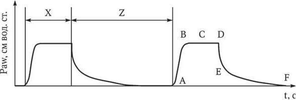 Х – время вдоха; Z – время выдоха; А – начало вдоха; В – пиковое давление на вдохе; С – давление на вдохе при нулевом потоке, начало паузы вдоха (плато); D – конец паузы (плато) на вдохе; Е – начало выдоха; F – конец выдоха